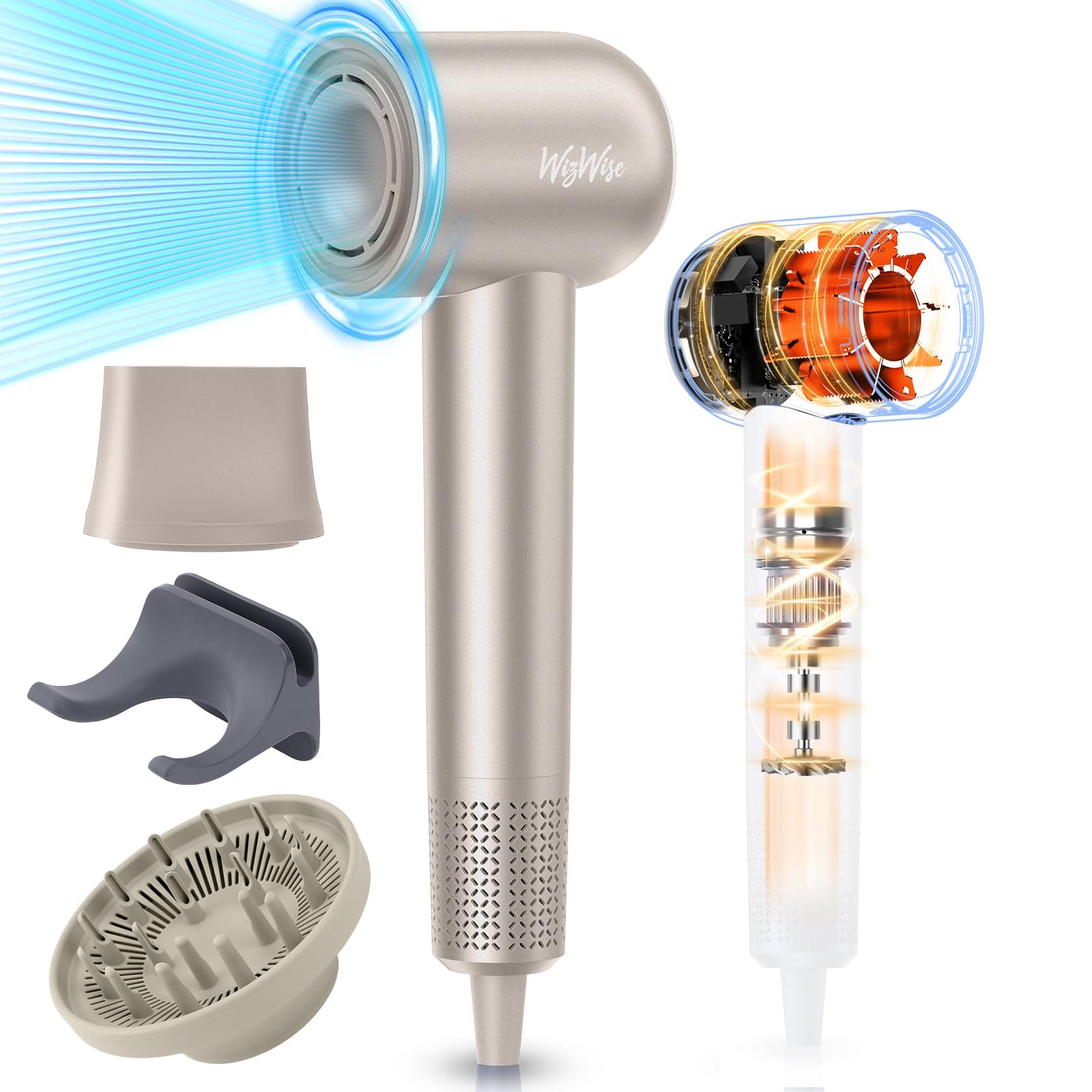 - Lightning-Fast Drying:The WizWise blow dryer is equipped with a three-phase high-speed brushless motor, reaching a maximum speed of 110,000 RPM and an airflow speed of up to 63m/s. Its performance is enhanced by 80%, making it five times faster than traditional hairdryers.