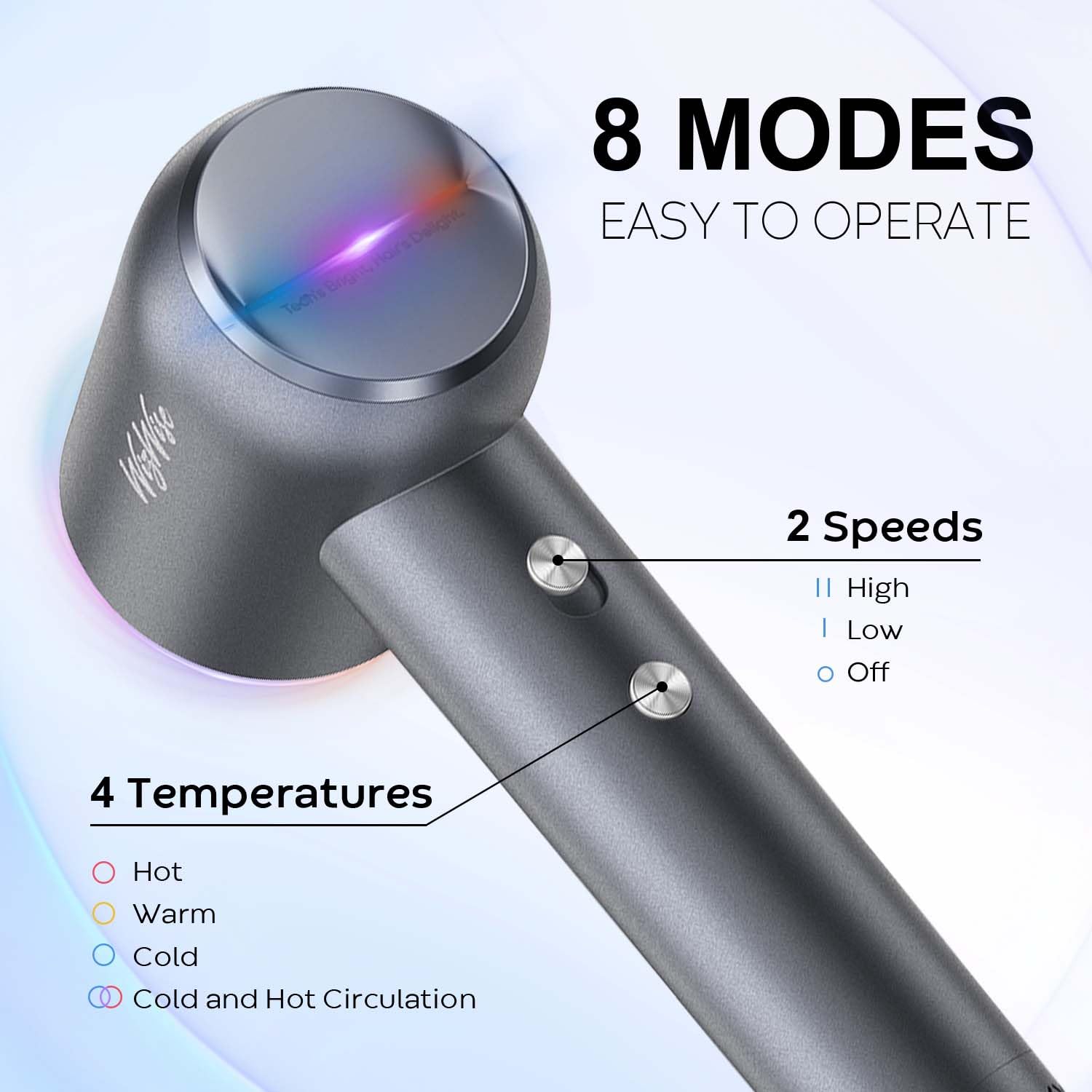 - 2 Wind Speeds and 4 Temperature Settings: Our diffuser hair dryer offers 4 temperature settings: blue light (77°F), orange light (140°F), red light (176°F), and purple light circulating mode. It provides 2 airflow speeds: low speed (78,000 RPM) and high speed (110,000 RPM). Meets various drying needs, allowing you to customize the drying combination that suits your hair.