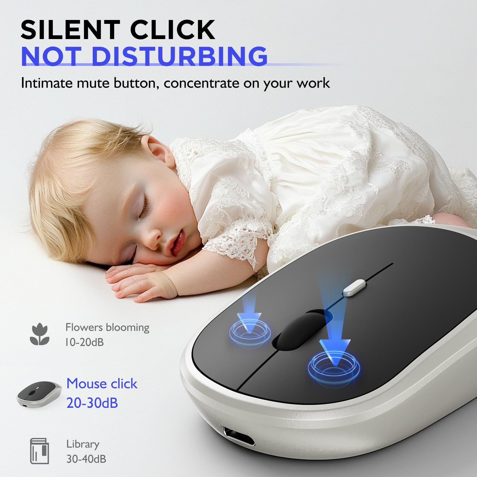 - Plug & Play Easy to Use - Cordless and soundless dual mode office mouse, 2.4GHz with USB mini unifying receiver (USB A doggle) or bluetooth connection. With streamlined symmetrical design, the wireless mute mouse fits snugly in any palm, offering superior comfort for users of all sizes, genders, and grip styles.