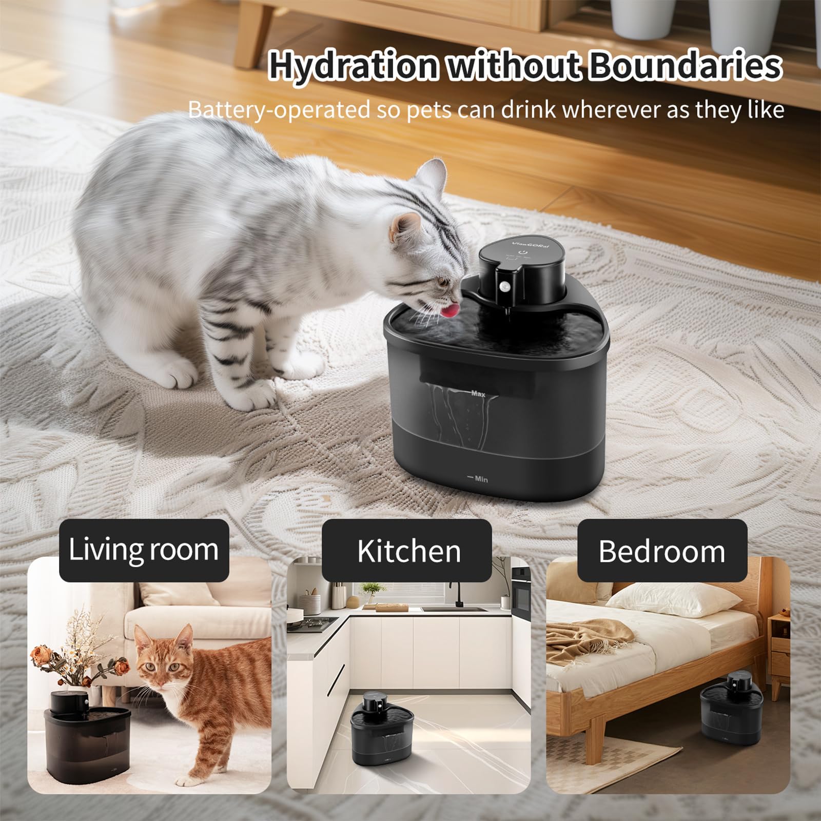 - 【Wireless Cat Water Fountain and All-in-one Pump Host】Cordless Water Fountain is free from the constraints of wires and can be flexibly placed according to the preferences of you and your pets, such as in the living room, dining room, kitchen, bedroom, etc. Effectively prevent pets from chewing wires and always ensure the health and safety of pets' drinking water.The integrated design of the water pump and outlet is more convenient and the installation is faster.