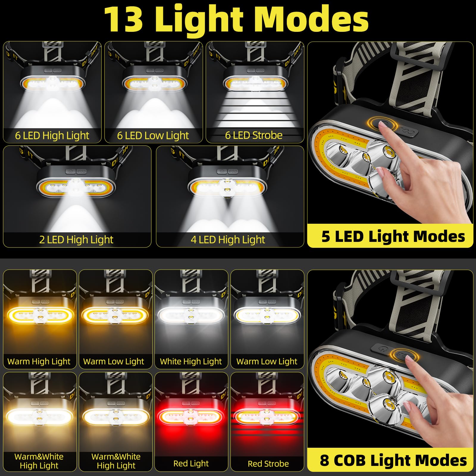- 【13 Lighting Modes 】 This headlamp features 12 different lighting modes( Long press 3s turn off ). 5 main light modes are: 6 LED High Light-6 LED Low Light-6 LED Strobe-2 LED High Light-4 LED High Light. 8 cob light modes are: Warm High Light-Warm Low Light-White High Light-.White Low Light-Warm&White High Light-Warm&White Low Light-Red Light-Red Strobe. Led head lamp adapts to various environments and activities.