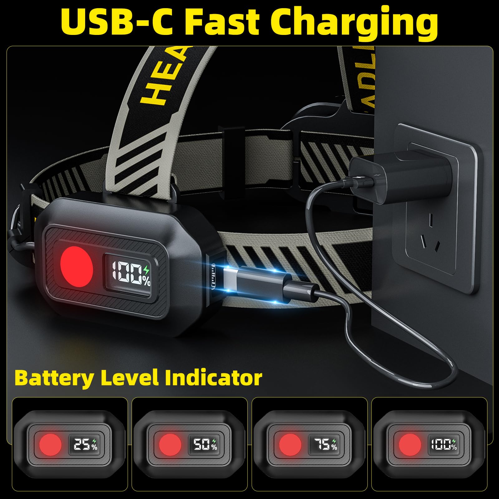 - 【USB-C Rechargeable Design】Say goodbye to disposable batteries! Rechargeable headlmps built in a 5000mAh battery that offers enhanced convenience and cost savings, and can be reused up to 100,000 times without replacing the battery. The package comes with a USB charging cable, USB-C fast charging 2 hours can make the headlamp power to 100% .