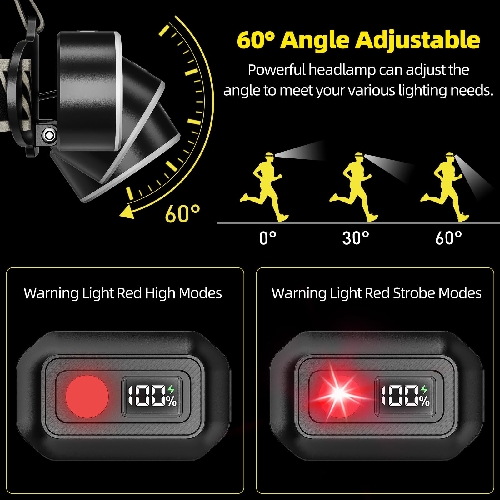 - 【Power Display & Warning Light】Headlamp's battery compartment has an LCD power display that accurately monitors the level of power and reminds you to recharge in a timely manner, as well as a red warning light for added safety during nighttime activities. Head lights for forehead can be rotated 60 degrees, allow you to adjust the angle and light up any corner you need.