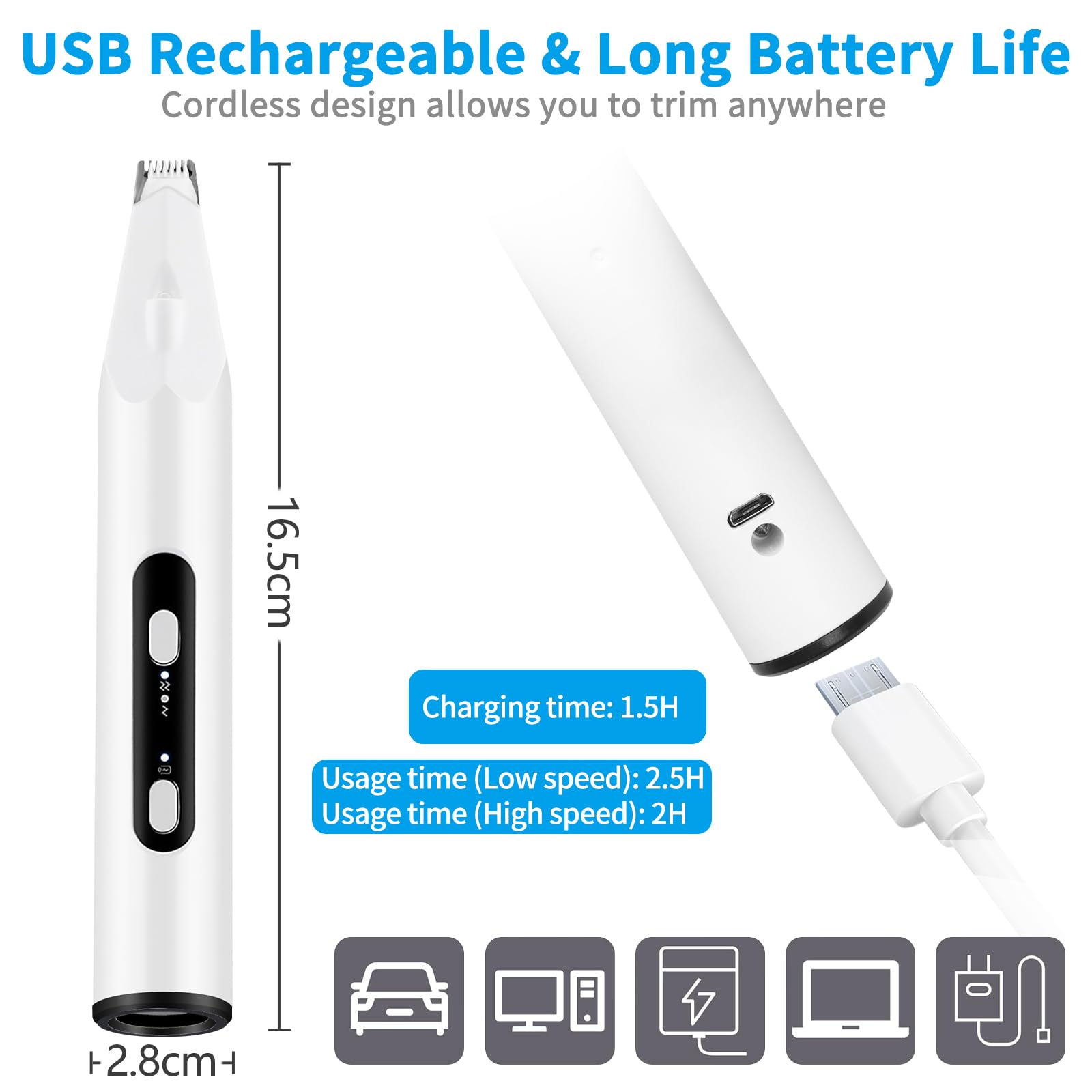 - [USB Rechargeable & 2 Hours Continuous Operation] Charges via a USB-C cable in just 1.5 hours - a full charge is enough for 2 hours of continuous trimming. Wireless operation allows free movement, ideal as a paw trimmer for dogs at home or on the go. Lightweight design at only 85 grams for effortless handling