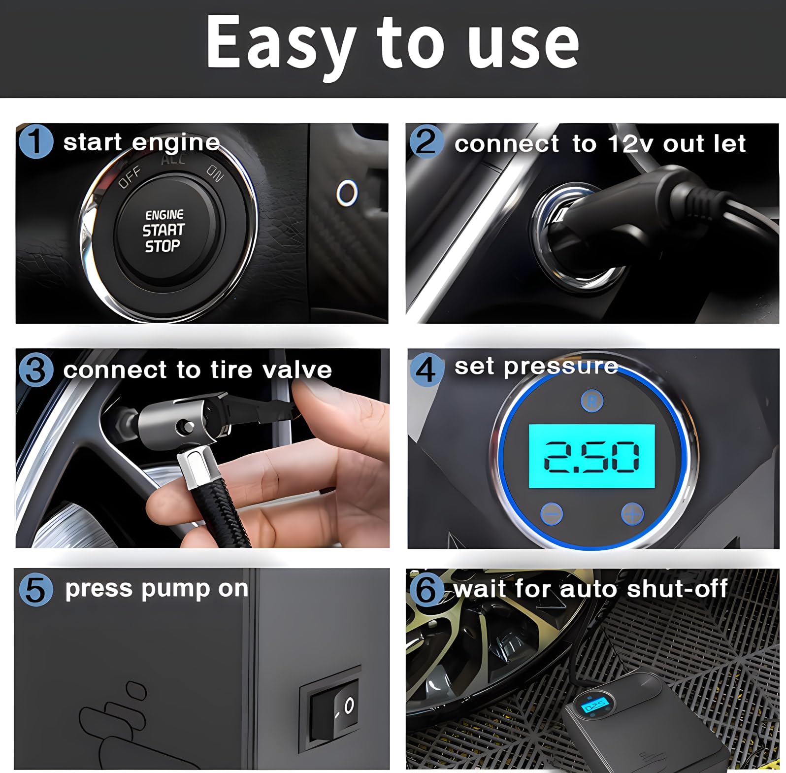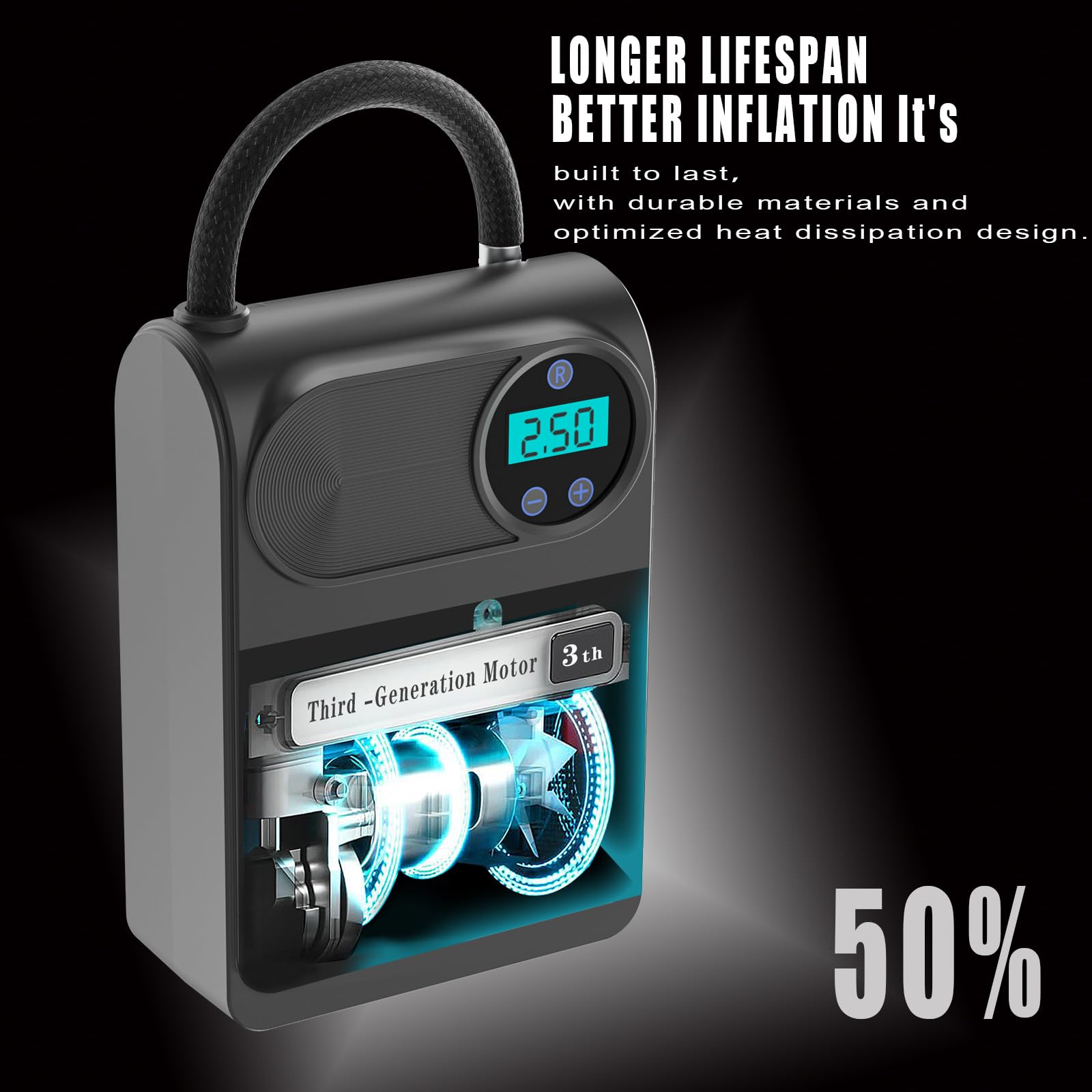 - 【Digital Screen】Tyre pump: The large digital screen displays the tyre's real-time pressure for a more accurate and intuitive experience. Air compressor tyre inflator Avoids pressure reading errors common with dial tyre pumps.