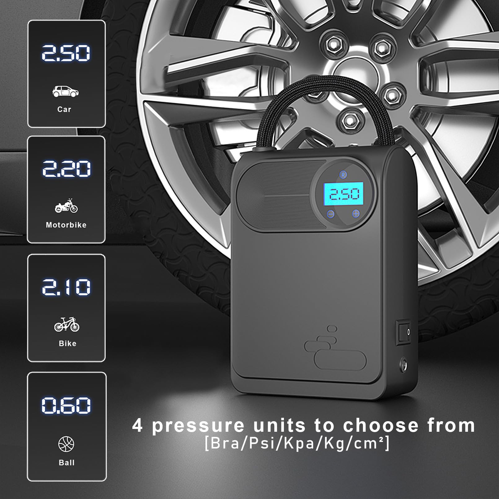 - 【Preset Tyre Pressure & Auto Shutoff】: This car pumps for tyres will automatically shut off once it reaches the preset value, no need to babysit the air pump for car tyres process and worry about overinflation.
