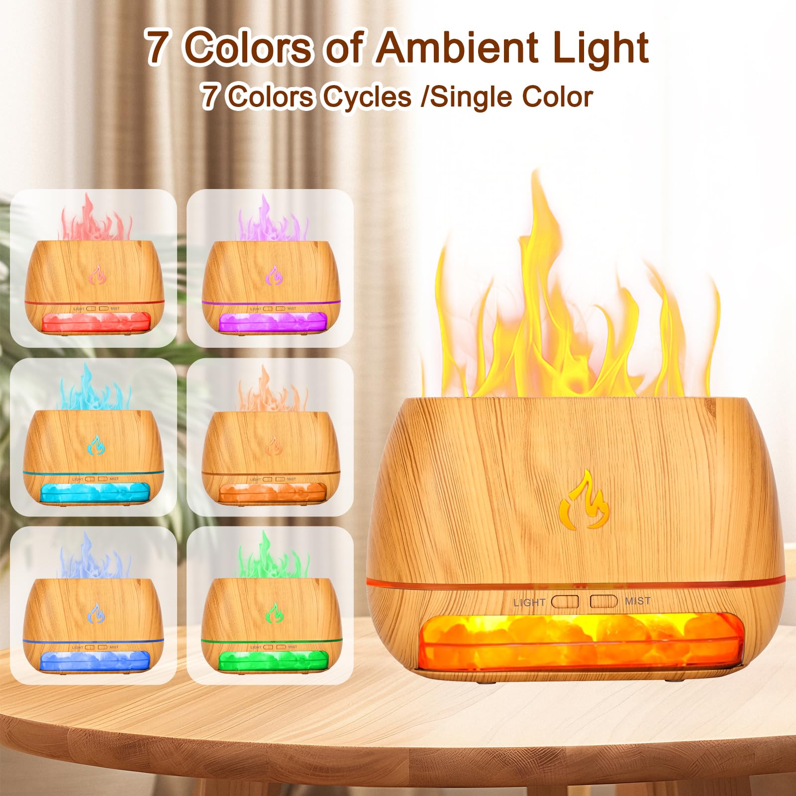 【LED Flame Effect Humidifier】Experience the ambiance of a soft, simulated flame with our innovative humidifier. It uses smart LED lighting to create a realistic flame effect, casting a warm, inviting glow. Enjoy the humidifier and flame lighting functions separately, or together as a comforting night light to enhance your sleeping environment.