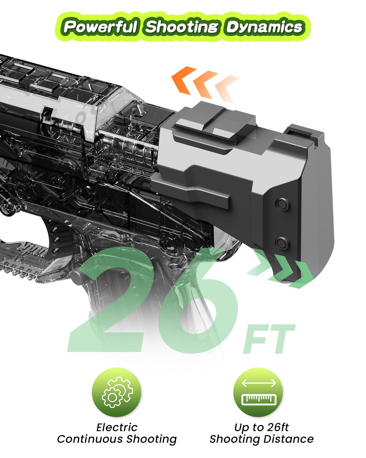 With a powerful water gun(See our video): With a completely transparent and technologically advanced full auto electric water gun, which provides you with excellent water injection power and an excellent shooting range of up to 26 feet.Whether you are shooting at a long distance or at a close range, this water gun can bring you surprises.The water gun is waterproof, so you don’t have to worry about damaging it during pool battles.