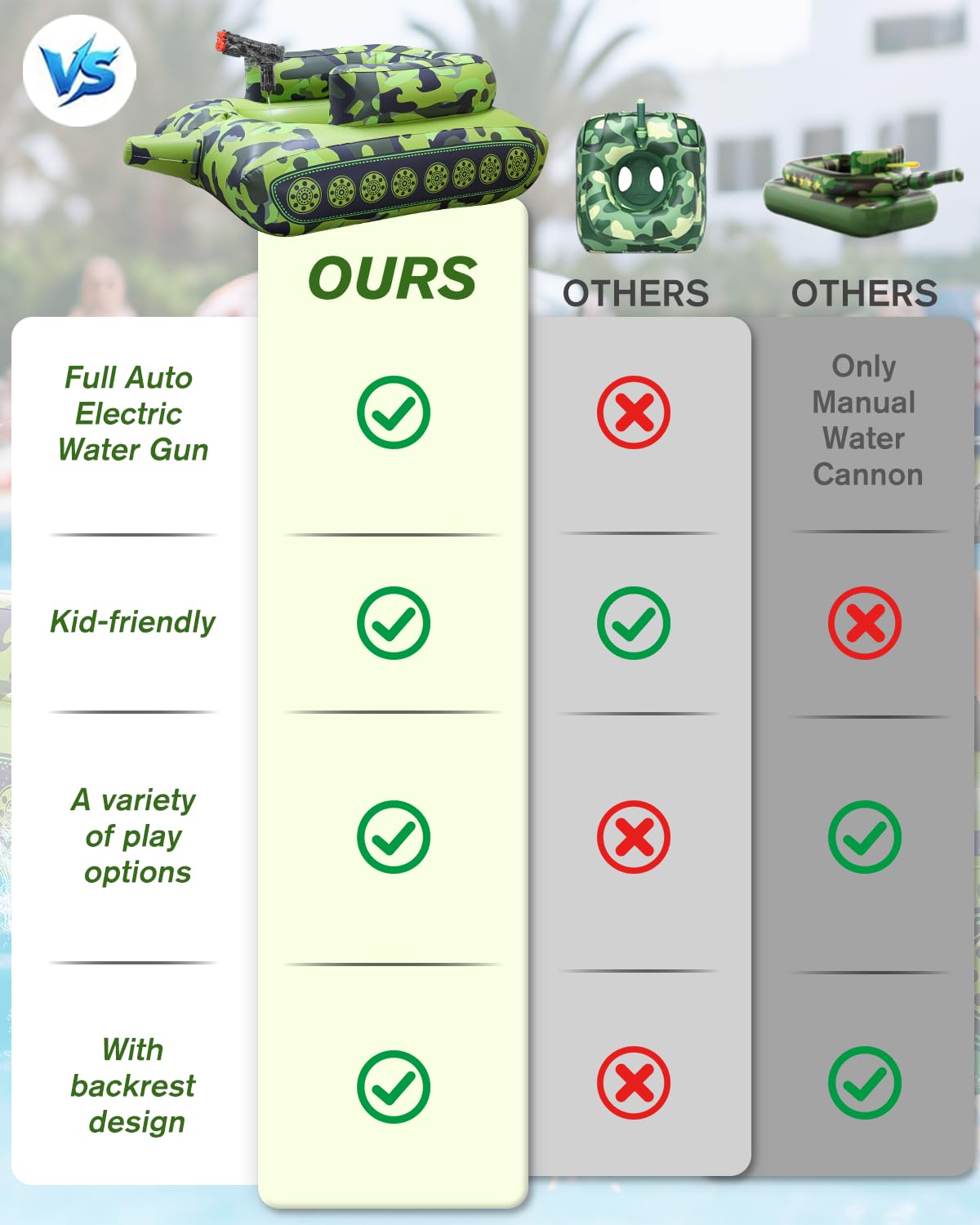 Tank pool armchair&electric water gun set:Sitting on an inflatable tank to play with an electric water gun can give us a feeling of being in the battle.A round hole is designed in the tank, and when you are not using the water gun, you can put the water gun on it to free your hands.Whether you want to relax or have a passionate battle, this set of equipment can meet your needs and let you spend an unforgettable summer!
