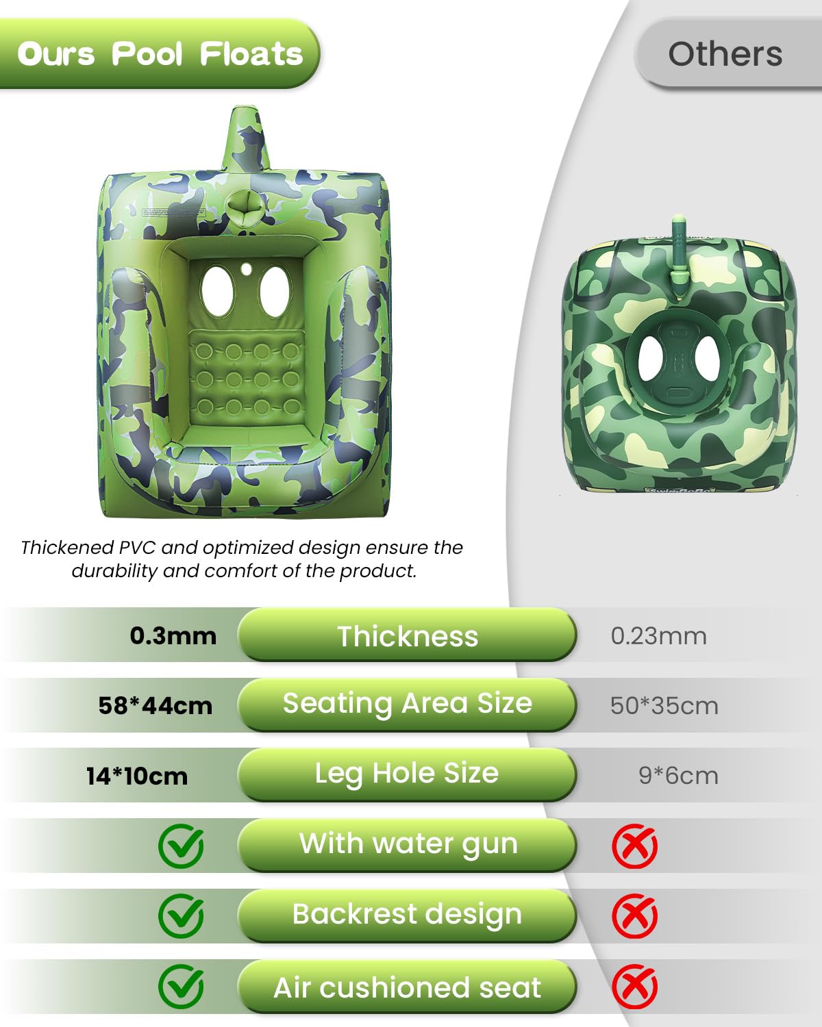 Comfortable&durable inflatable tank pool armchair:our pool floats use 0.3mm thick PVC,more durable,stronger load bearing capacity.The thickness of others on the market is 0.23mm.The seat adopts air cushion design, which is more comfortable,and backrest design makes you more relaxed while sitting. There are 2 leg holes designed on the seat,so we can keep our feet cool in the water.Try it!These unique designs will definitely meet all your requirements for pool chairs.