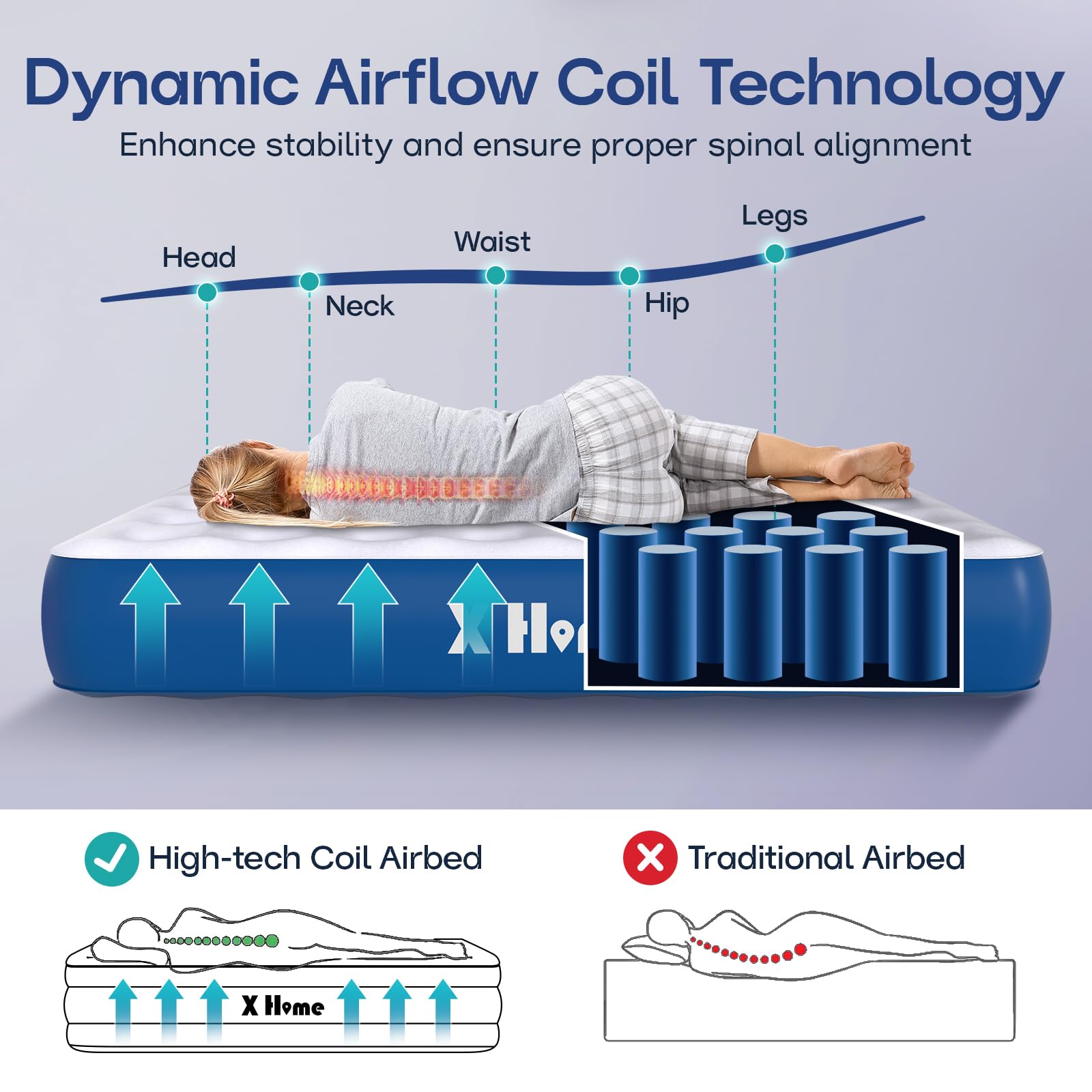 【Lasting Stability】 Meticulously fashioned from puncture-proof PVC, bolstered by a resilient 0.6mm flock-top layer, and fortified with precision stitching to support up to 650lb, the inflatable bed thwarts air seepage and sagging, and ensures steadfast stability for an uninterrupted and blissful slumber.