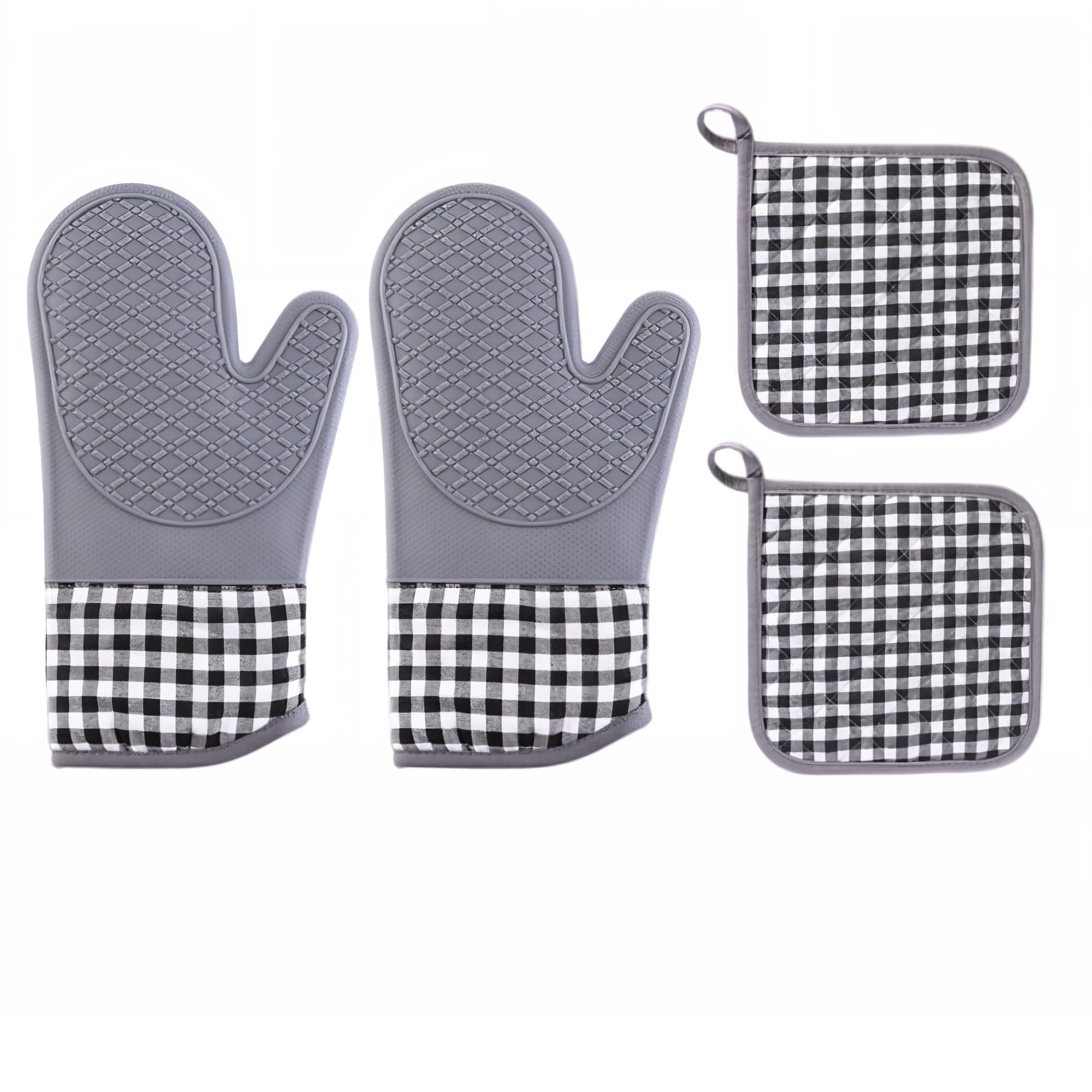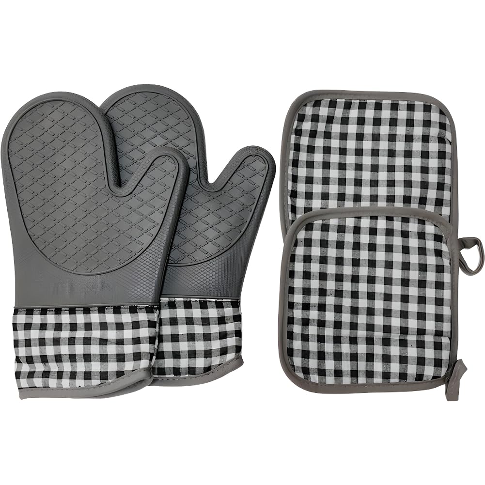 【Oven Mitts Set】The inner layer of this oven mitts set is made of breathable polyester cotton, which provides a good protection and comfortable touch for your hands. These kitchen mitts are also with long wrist guard. The length has reached 13.4 Inches to protect your forearms from scalding when you reaching into an oven, provide generous coverage for your arms. 4 PIECE KITCHEN ACCESSORY SETS: -The oven mitts and pot holders set including 2pcs non-slip silicone kitchen oven gloves (7.5X13in), 2pcs pot holders (8X8in), fit for indoor cooking, baking, BBQ or outdoor grilling.