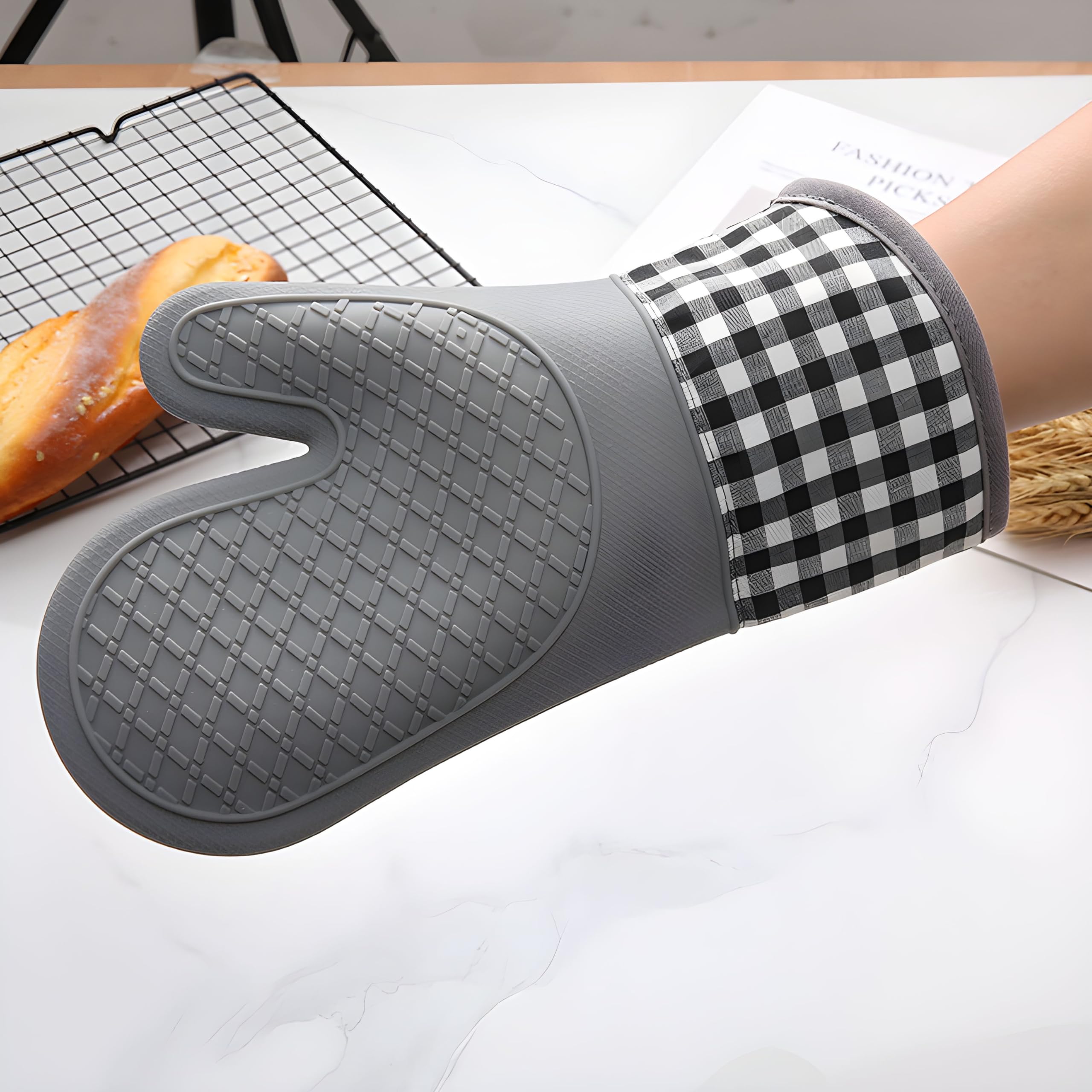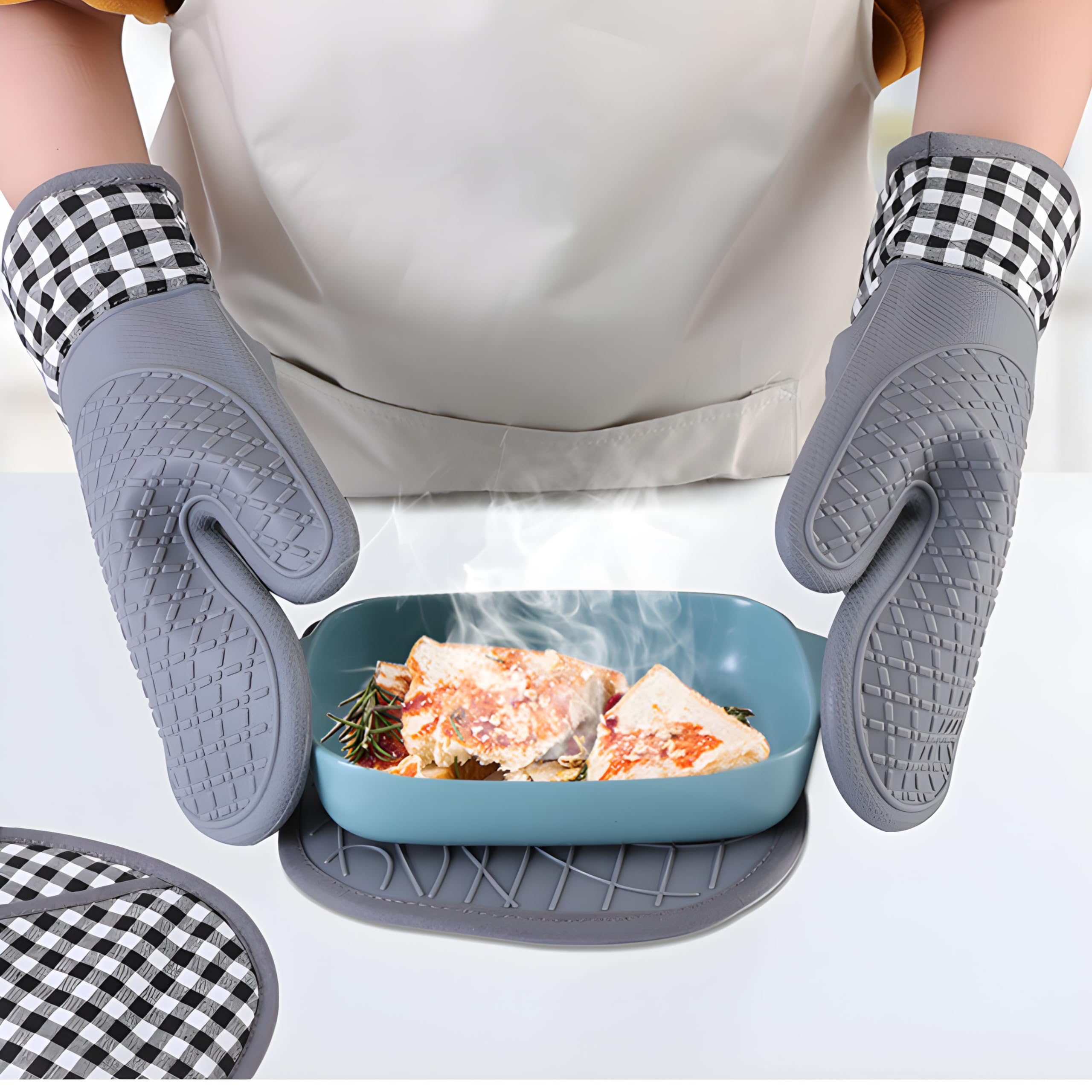 【COMFORTABLE AND FLEXIBLE】Our heat-resistant oven mitts and potholders feature a quilted super-soft breathable cotton lining on the inside, providing you with comfortable and breathable touch and protecting your skin as well, with enough air circulation to keep your hands from getting sweaty in summer or high temperature conditions. Our oven gloves won't wear or tear, and the non-slip textured grip provide a safe and stable hold on different kinds of hot and slippery kitchen items. The cooking mitts are quite easy to clean and reserve, suitable for machine washing and hand washing.