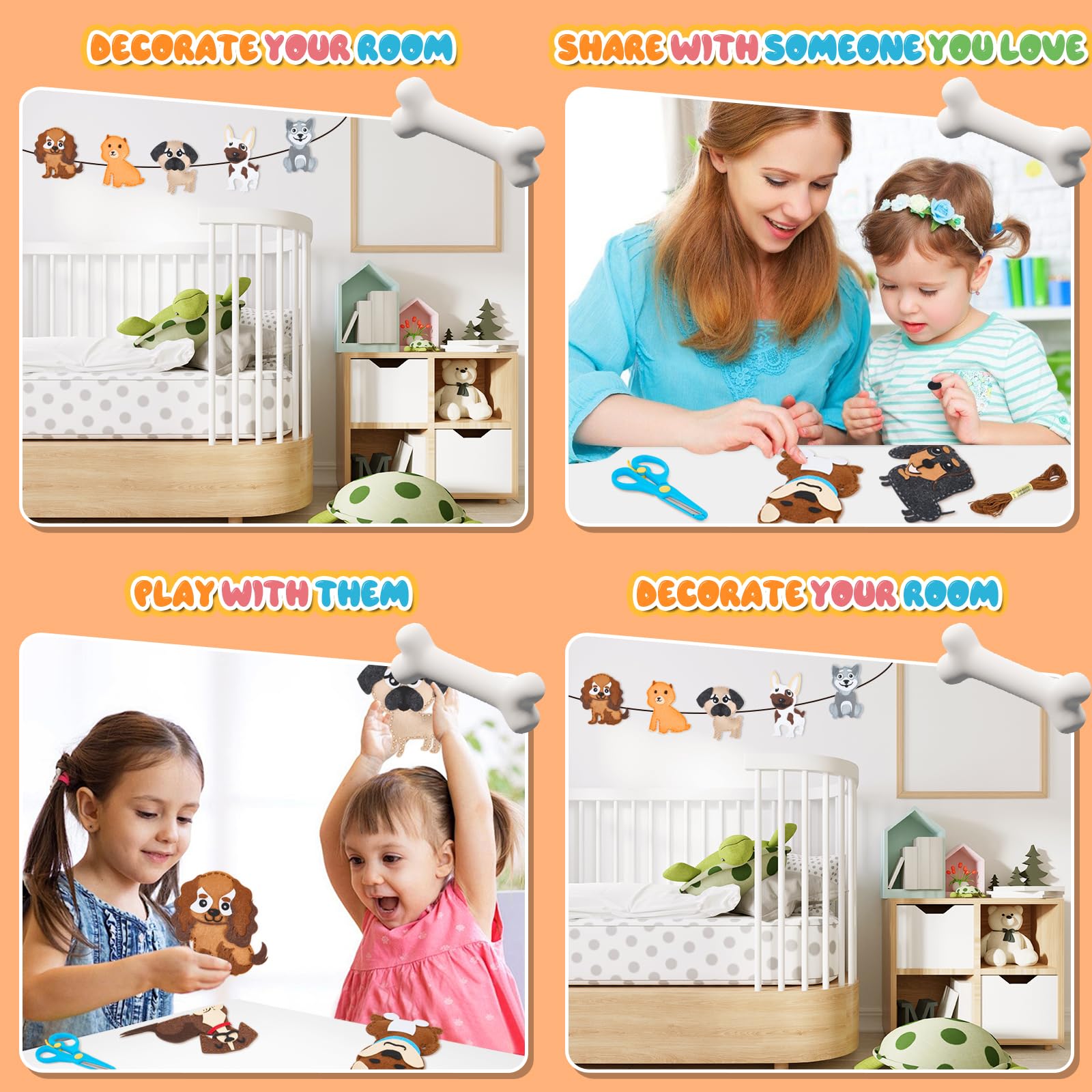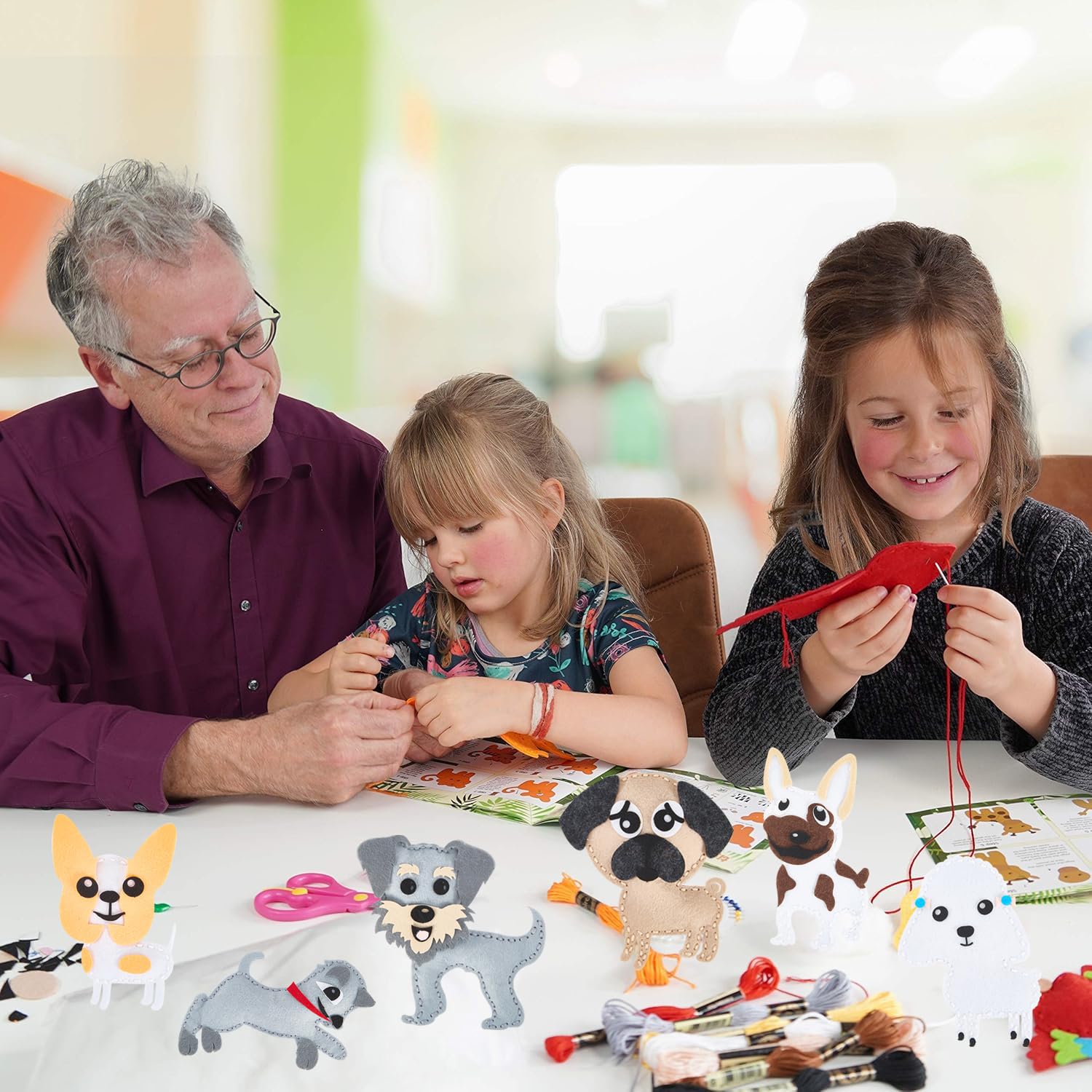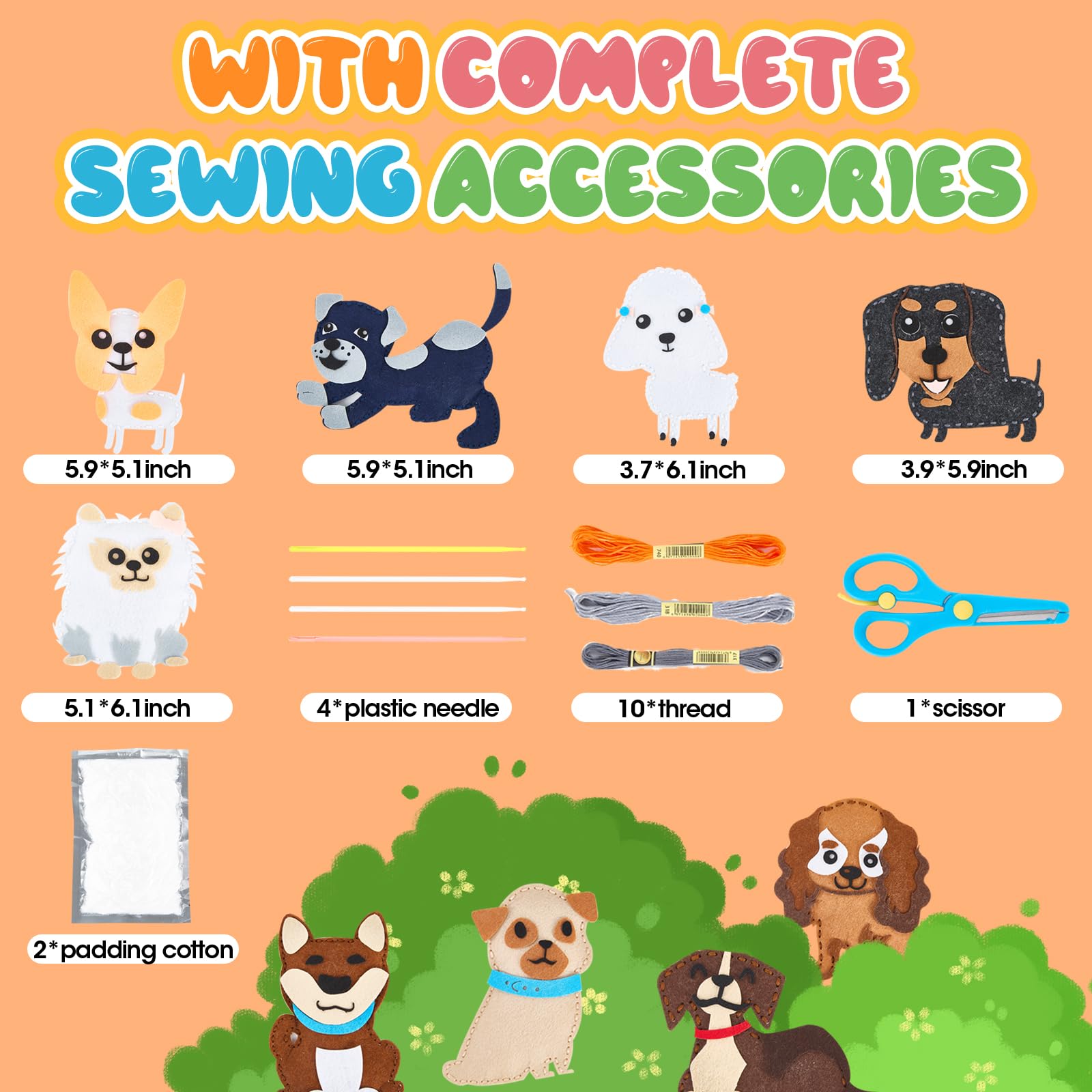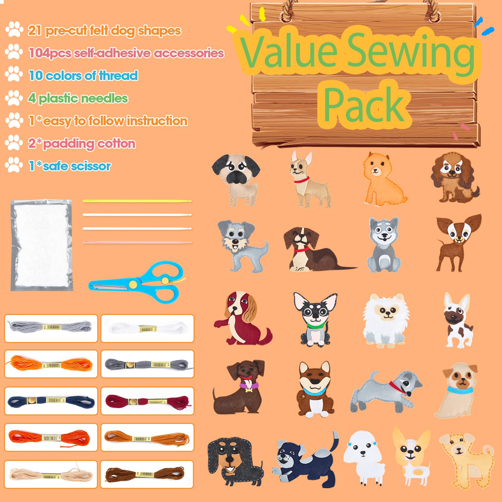 - Complete Sewing Kit: Felt craft sewing kit contains 21 pre-cut dog felt shapes, 104 self-adhesive accessories, 4 plastic needles, 1 pair of scissors, 2 packs of stuffing cotton, 10 colors of thread, 1 instruction manual, everything your kids need to start sewing, start a happy sewing journey