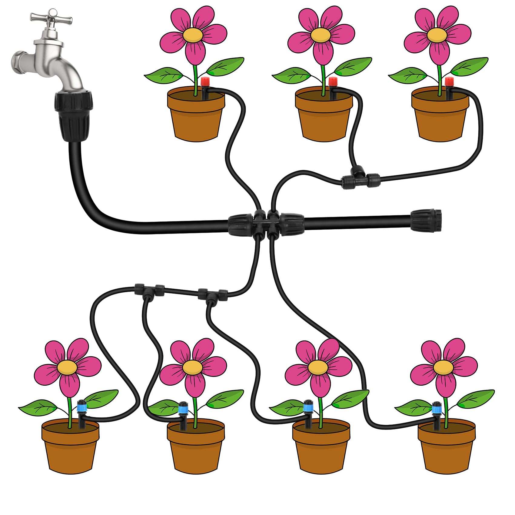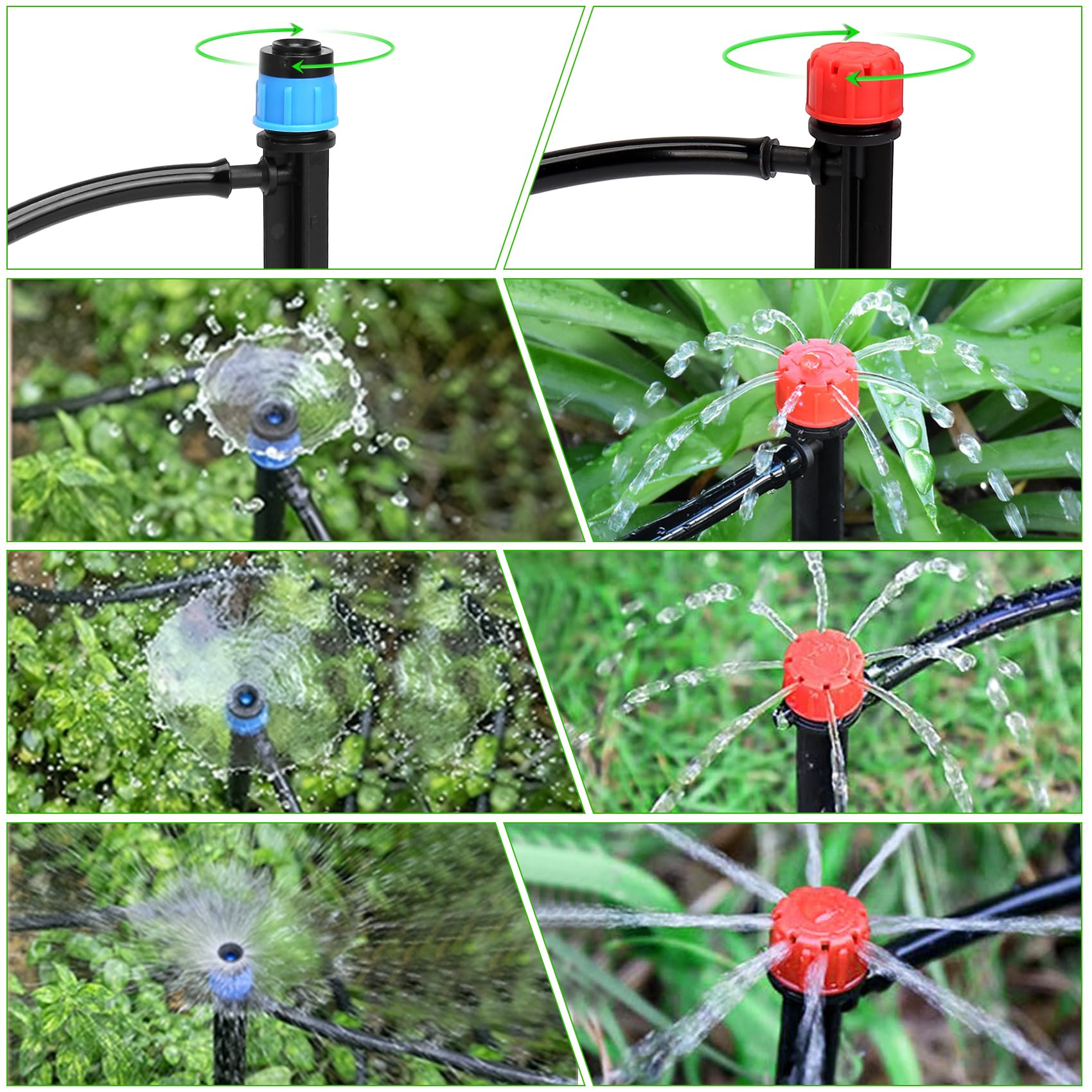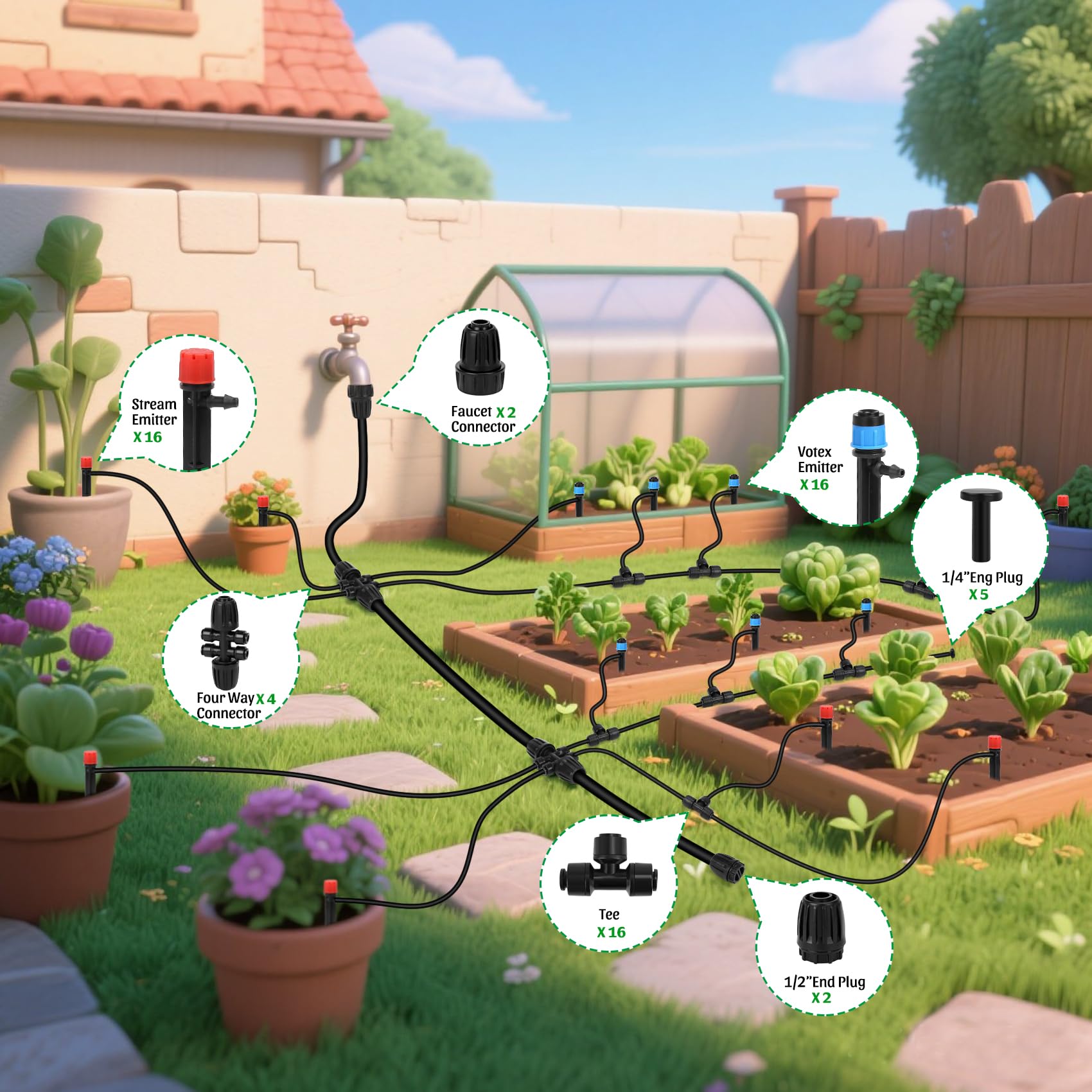 - All-inclusive drip irrigation system:Includes Vortex Emitters (for steady drip) x16, Stream Emitters (for adjustable flow) x 16, Four-Way Connectors x4, Faucet Connectors x4, End Plugs (1/2")x2, End Plugs (1/4")x5 to seal tubing lines securely. Teflon tape and 10 nylon zip ties, User-Friendly Manual