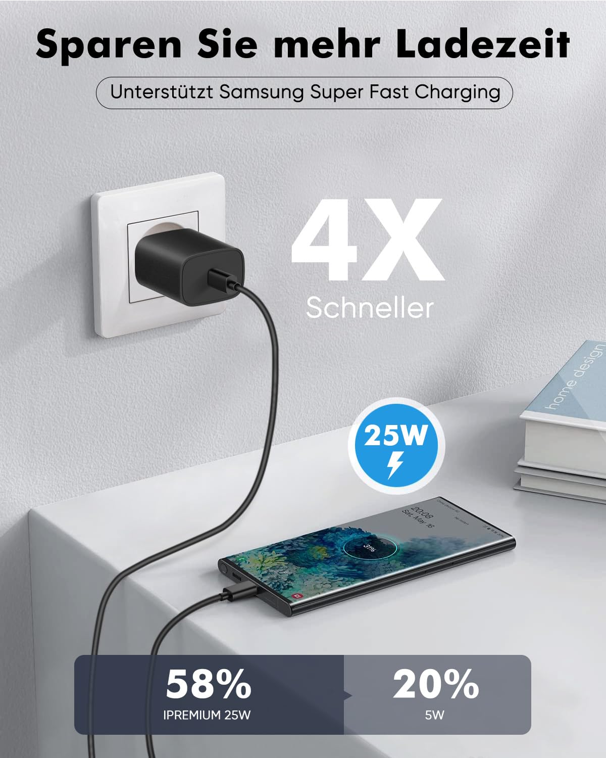 - 25W Samsung fast charger: This USB C charger uses the latest fast charging technology and can quickly charge your Samsung Galaxy/phone devices. Charge your Samsung s23 Ultra quickly from 0 to 60% in about 30 minutes, 5X faster than a 15W charger, so you can fully charge the battery of your Samsung in record time.