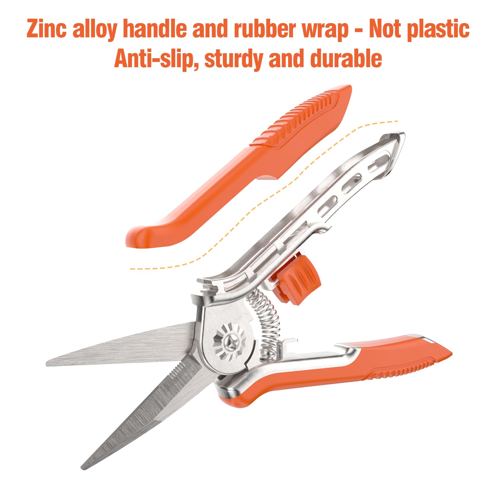 - 【Ergonomic Zinc Alloy Handle】The Pruning Shears for Gardening feature a high-quality zinc alloy handle, wrapped in a soft rubber coating, offering gardeners superior comfort and control. This design reduces hand fatigue even during extended use and ensures a secure, non-slip grip, making your trimming experience more comfortable and efficient.