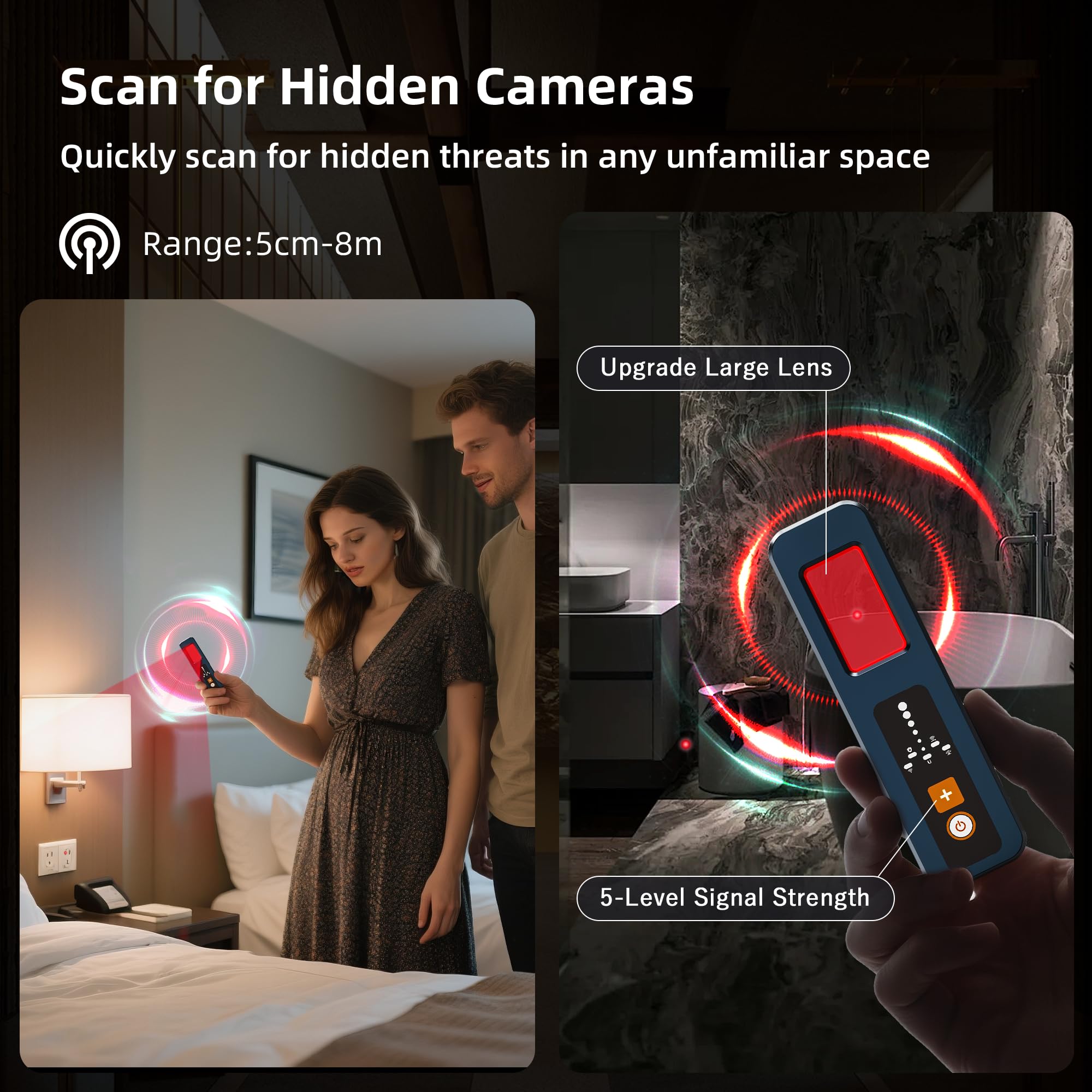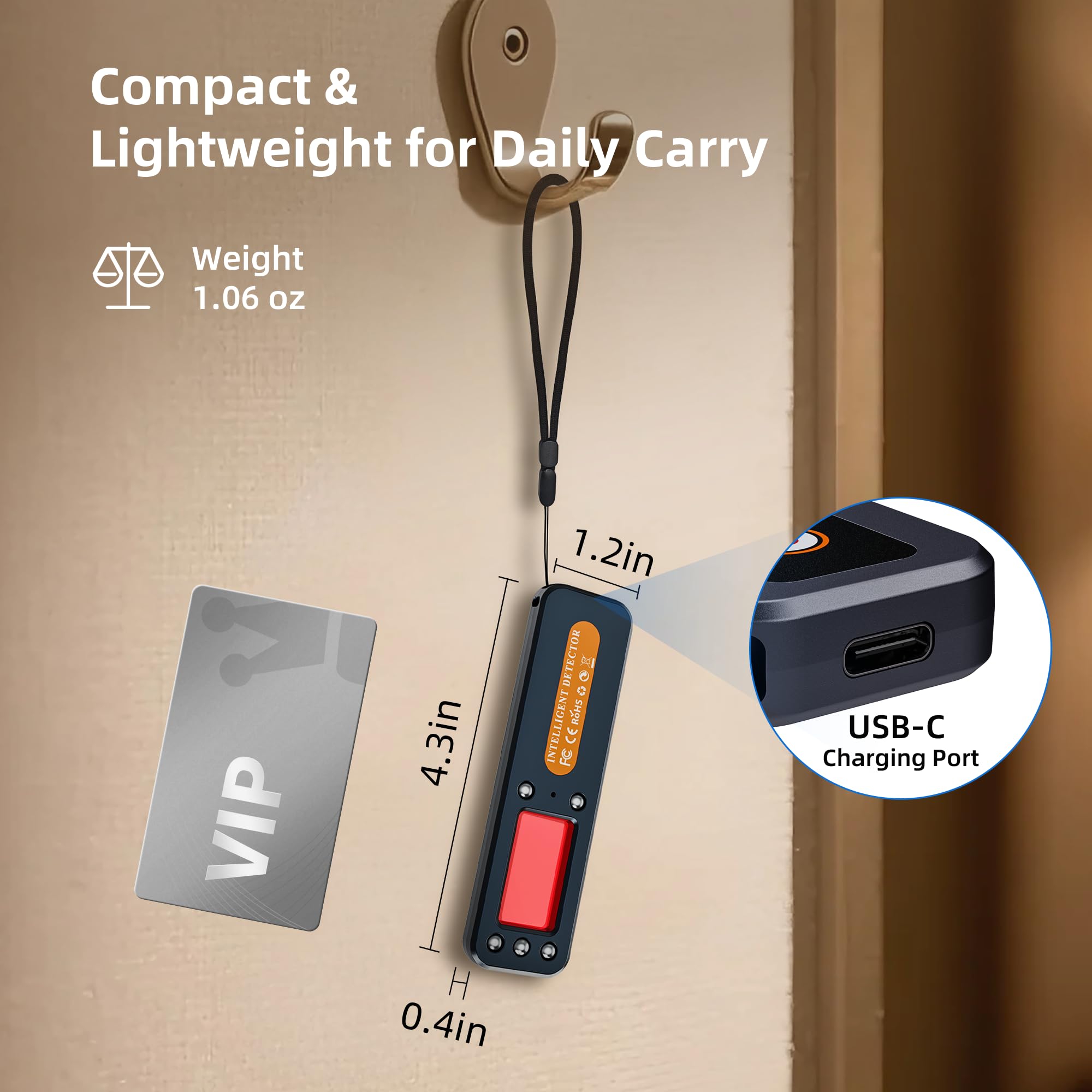 - 5 Detection Modes with Anti-Theft Alarm: Switch between RF, magnetic, lens, infrared, and motion alarm modes. Hang it on a doorknob or bag — when moved, it emits a loud alert. Provides effective privacy and theft protection without any apps or connections.